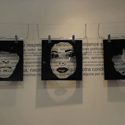 Instalación de 90 serigrafías sobre capas de malla superpuestas. La temática tiene que ver con las mujeres y niñas desaparecidas en pandemia.